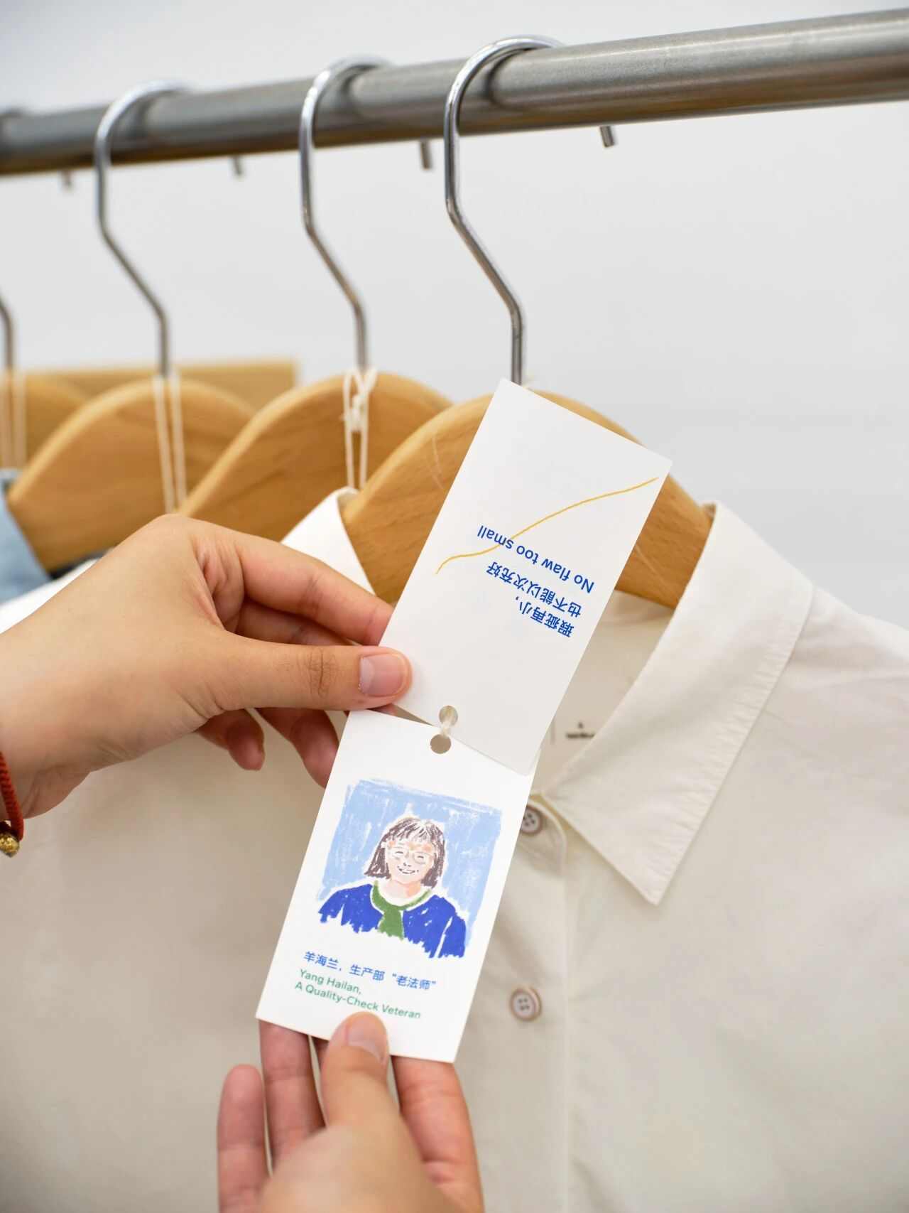 为了让瑕疵品循环起来,我们和羊师傅,还有整个生产线上的同事们,建立了一套全新的瑕疵品再利用系统和操作流程,重新定价、贴标签、挂吊牌,把本该被处理掉的瑕疵衣物重新带入生活。