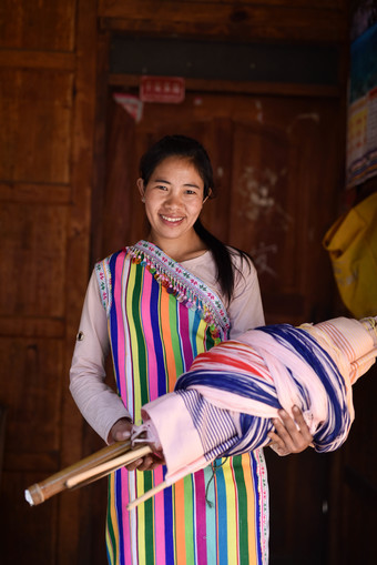 织女正在使用腰机织布,老式织布机被直接穿着在腰部,布匹的另一端被固定在梁柱上,横向来回织布。独龙毯也因此可以织到很长,宽度则与身体宽度接近。